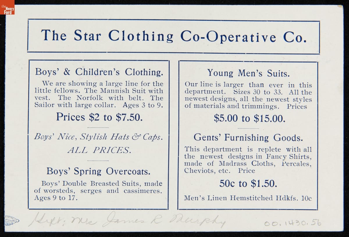 As color printing gained momentum in the late 19th century, trade cards became a major means of advertising goods and services. Americans enjoyed and often saved the little advertisements found in product packages or distributed by local merchants. This trade card advertises the Star Clothing Cooperative in Grand Rapids, Michigan.