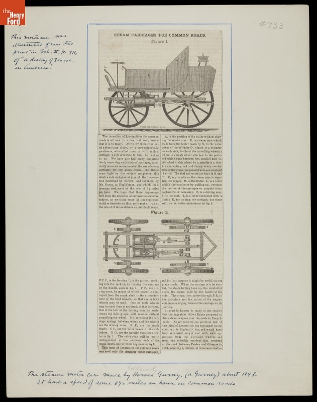 Description beneath: The steam motor car made by Goldsworthy Gurny (of Gurney) about 1848. It had a speed of some 8 1/2 miles an hour on common roads.