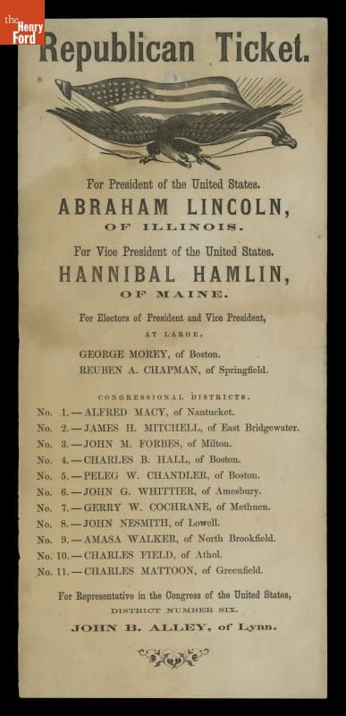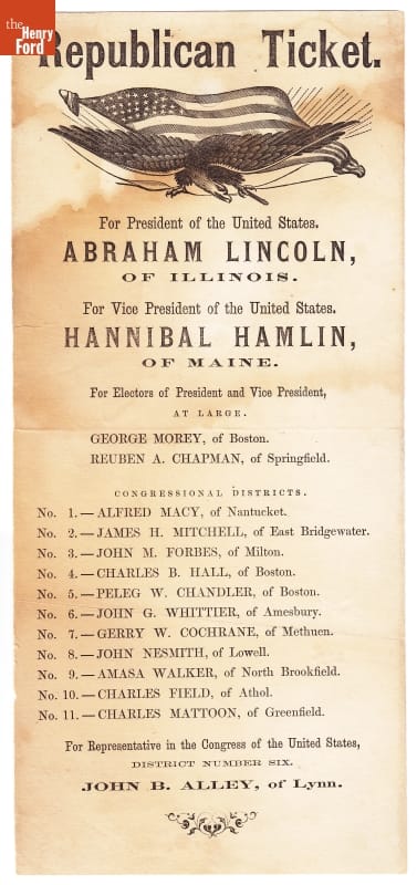 During the mid-1800s, Americans used preprinted ballots to vote. Political parties printed and distributed these ballots, sometimes through local partisan newspapers. These ballots listed candidates only from a single party -- so everyone knew who you voted for. Bold voters could scratch out or paste over names. This ballot was used in 1860 by Massachusetts Republicans to vote for Abraham Lincoln.
