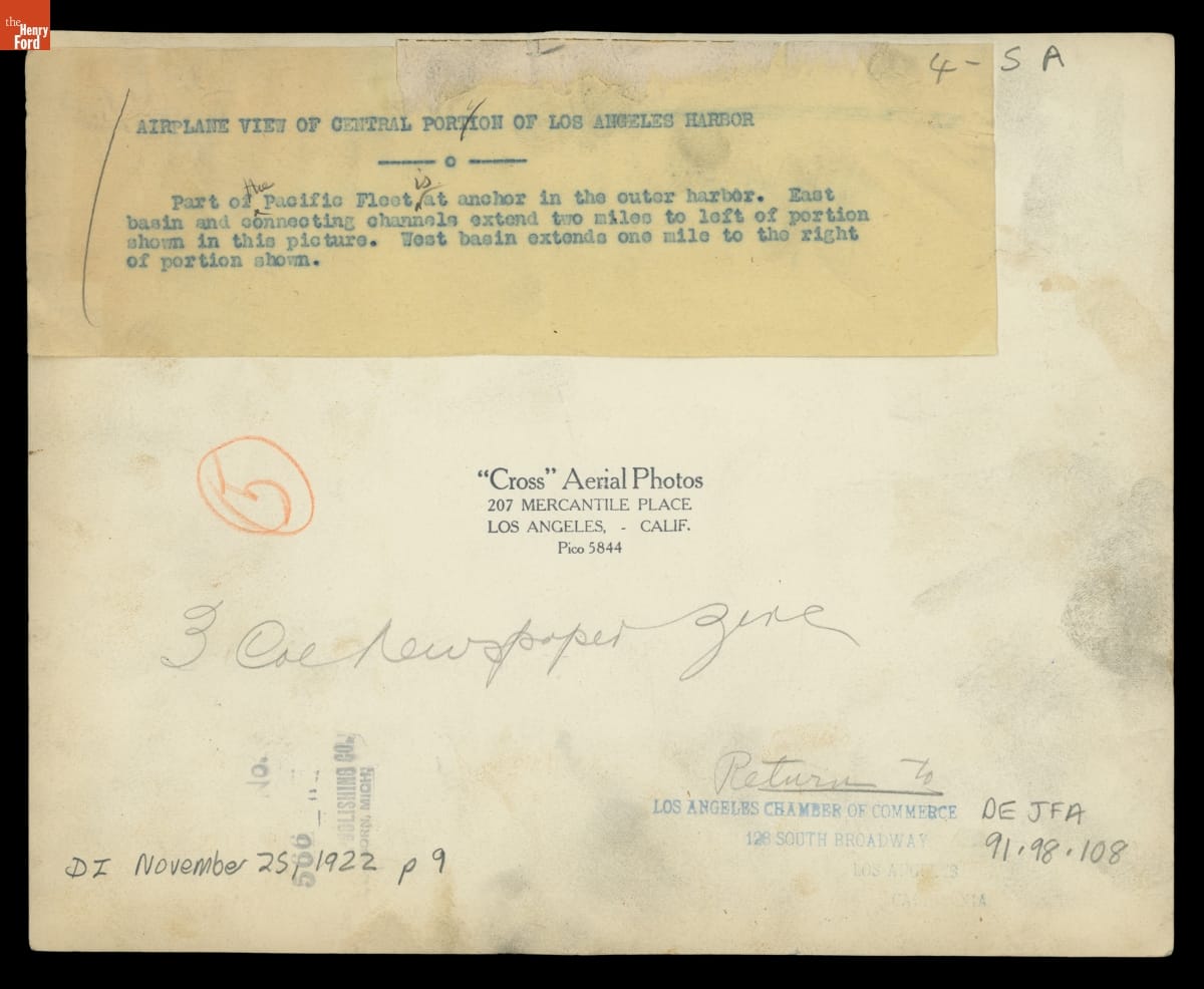 Military aerial reconnaissance during World War I accelerated the evolution of domestic aerial photography after the war. The sprawling city of Los Angeles became an important center for commercial aerial photography. Survey companies like Cross Aerial Photos, which captured this view, created images that remain important documents of the rapid urbanization of Southern California in the 1920s.