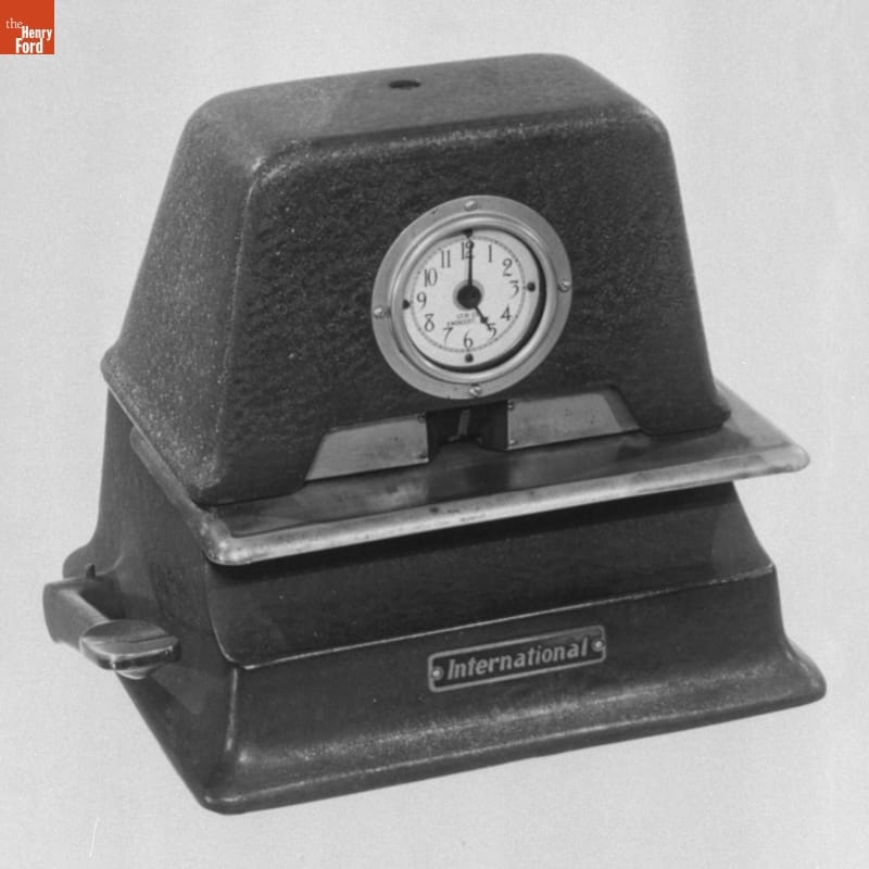 The Pellow Machine Company in Detroit, Michigan, used this time recording punch clock from 1938 until their closure in 1977. This is a desktop model with an electric clock and a horizontal tray into which worker would slide their punch card. Such time clocks both regulated employees' workdays and helped insure accurate calculation of their pay.