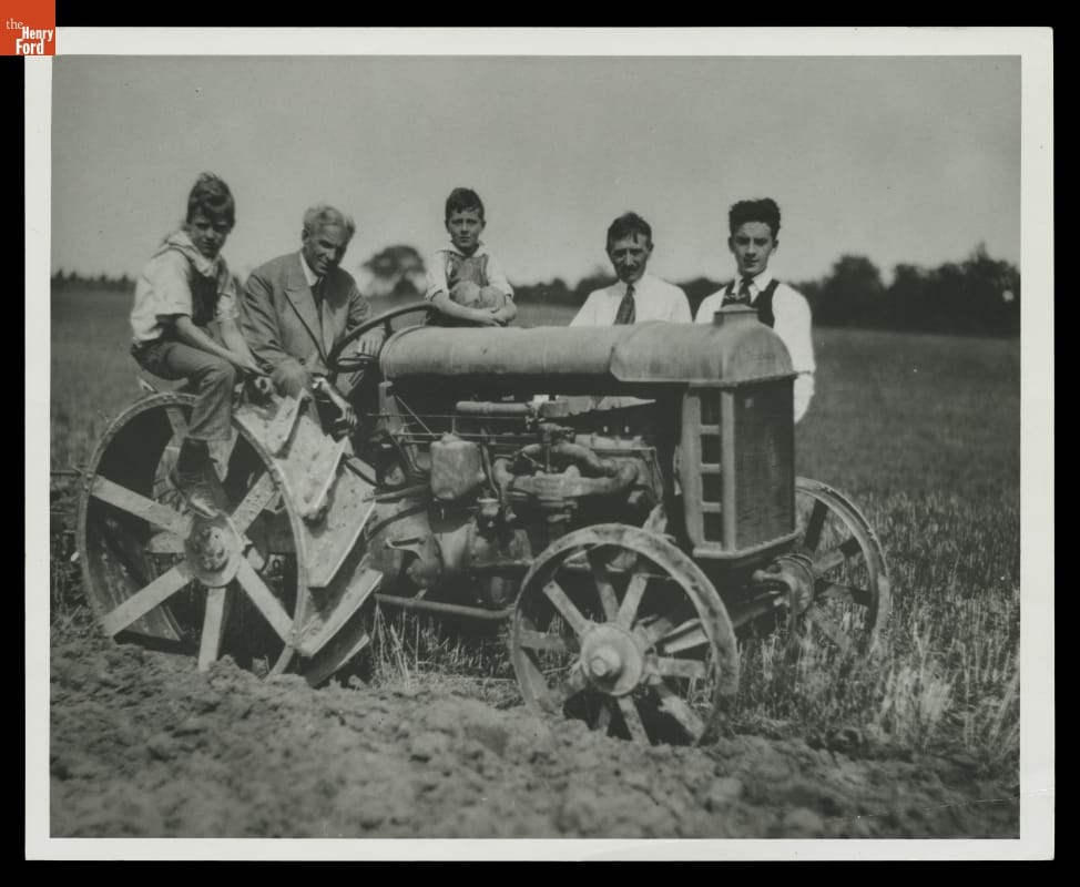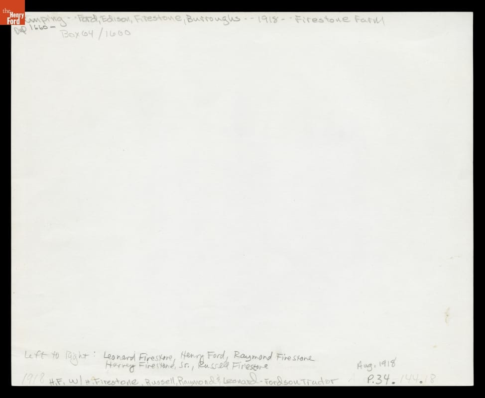 Henry Ford and Harvey Firestone went on several camping trips as "vagabonds," a group that also included Thomas Edison and naturalist John Burroughs. In 1918, Ford met Firestone at his old homestead near Columbiana, Ohio, (now in Greenfield Village) before joining Edison and Burroughs in Pittsburgh. Ford demonstrates his Fordson tractor, soon to become the most popular tractor in America.