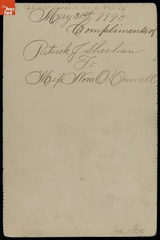 Growing American urban centers spurred the creation of modern police departments in the mid-1800s. By the end of the century, most police officers wore military-type uniforms and badges to help citizens easily identify them. This cabinet card shows Patrick Sheehan decked out in his uniform. Friends and family usually exchanged cabinet cards, sometimes adding a personal greeting on the back.