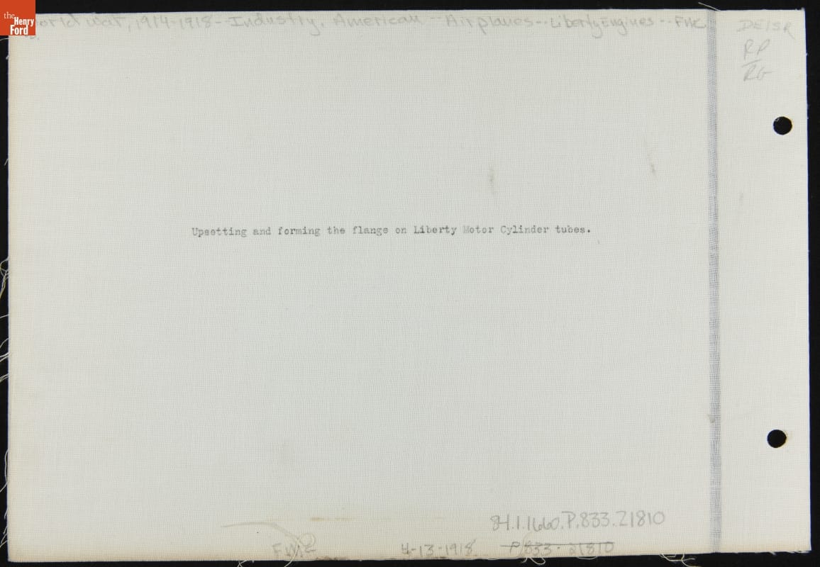 Ford Motor Company Workers Upsetting and Forming the Flanges on Liberty Motor Cylinder Tubes, April 1918