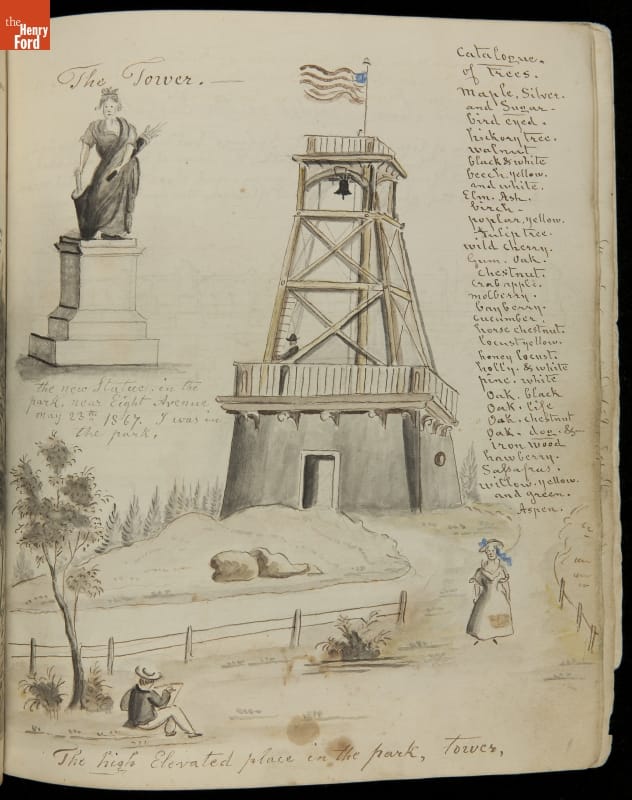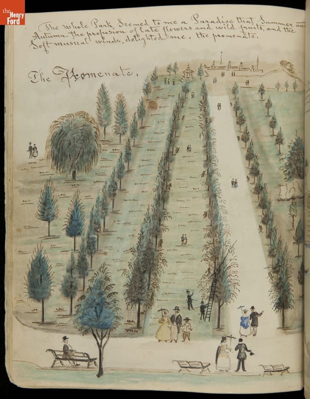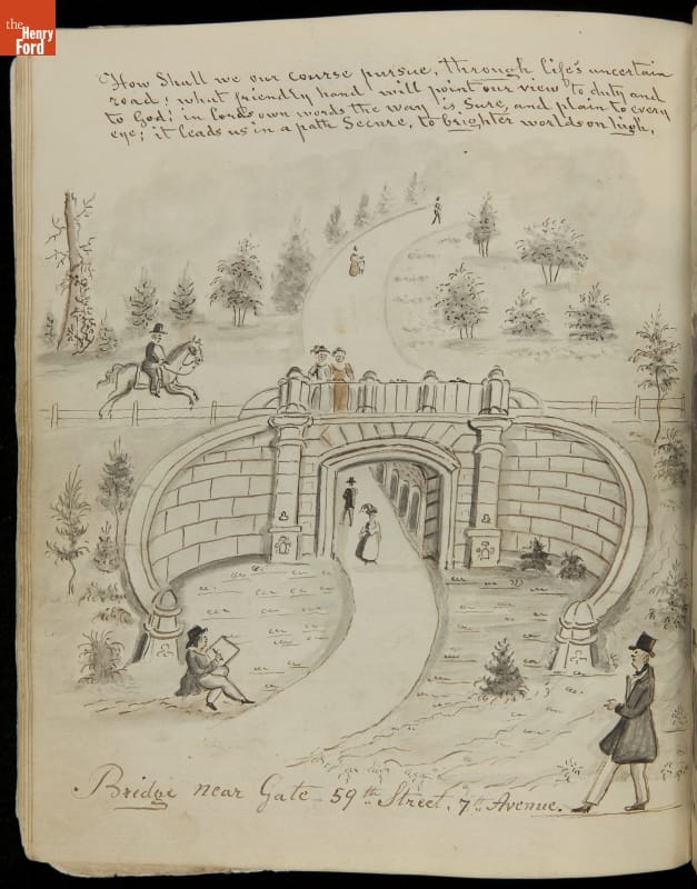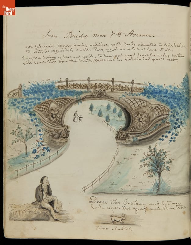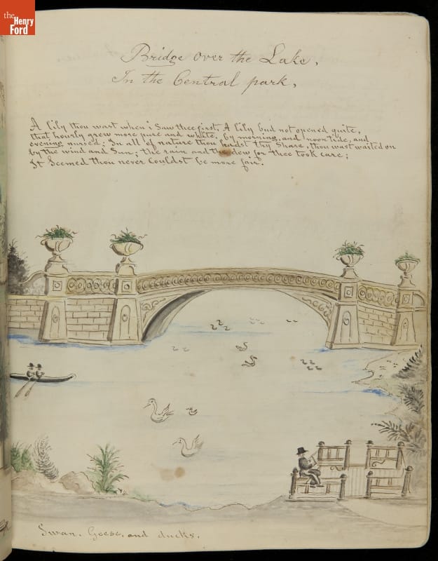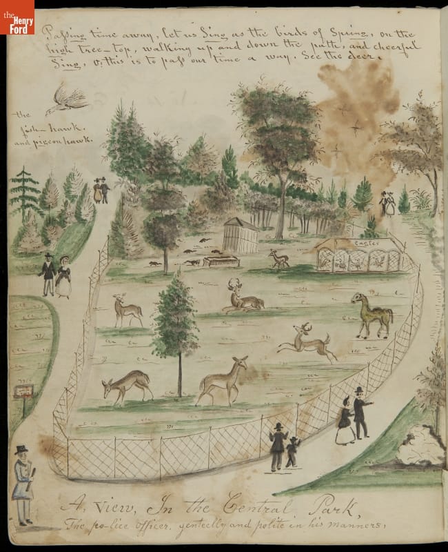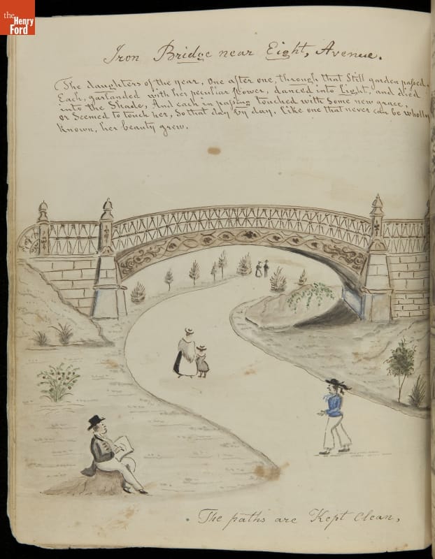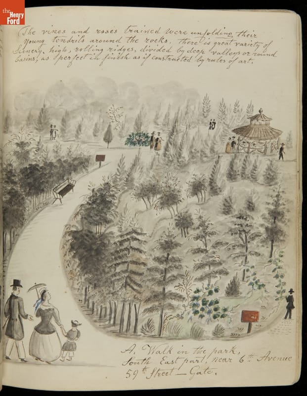 Lewis Miller is known today as a Pennsylvania folk artist. A carpenter by trade, Miller is noted for his many journals, illustrated with watercolors of historical and everyday events. He traveled widely in Europe and America. This 54-page album documents the early features and structures of New York City's Central Park--the greatest landscape project in 19th-century America.