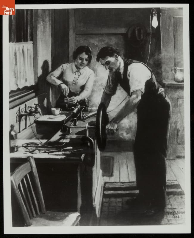This painting shows Clara Ford acting as her husband's assistant during an early experiment with Henry's first gasoline engine. It happened at the kitchen sink of their home on Bagley Avenue in Detroit, on Christmas Eve 1893. The artist, Irving Bacon, made this painting in 1938 based on Henry Ford's verbal reminiscence about this pivotal career event.