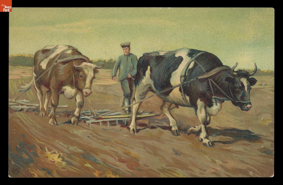 Oxen were the main source of power on many farms before the development of portable steam and internal combustion engines. Under yoke, as shown here, they could haul a wide range of heavy objects: logs and boulders; vehicles, like wagons; or agricultural equipment, like plows. Using specially designed treadmills, oxen could also power stationary machinery in barns or farmyards.