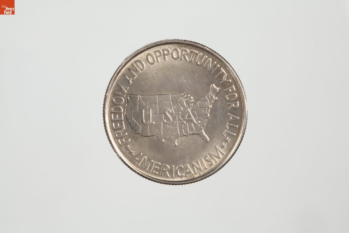 The second U.S. coin commemorating African Americans featured two Tuskegee Institute educators, president Booker T. Washington (1856-1915), and agricultural scientist, George W. Carver (early 1860s-1943). The U.S. Mint commissioned African-American sculptor and artist Isaac Scott Hathaway to design the coin. Issued from 1951 to 1954, the inscription on the back emphasized patriotism and individual liberty amid growing Cold War tensions.