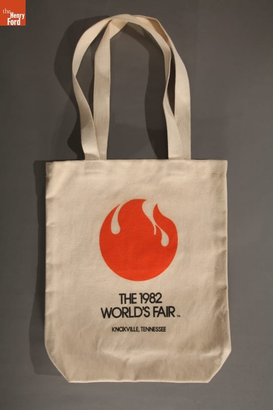 "Energy Turns the World" was the theme of the 1982 World's Fair. The fair, held in Knoxville, Tennessee, attracted over eleven million people during its six-month run. The fair's circular flame logo could be seen everywhere. It adorned many promotional and souvenir items, like this canvas tote bag.