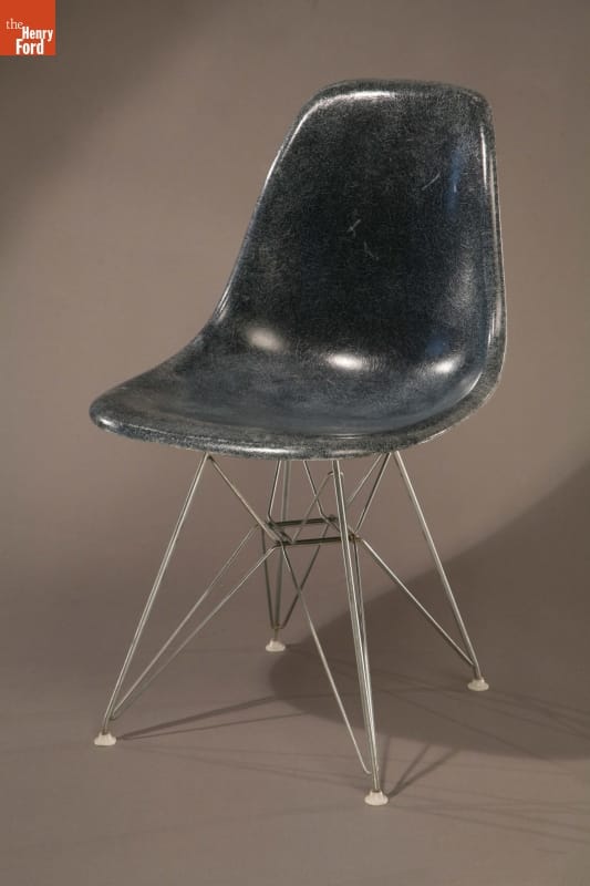 Husband-and-wife designers Charles and Ray Eames' now ubiquitous fiberglass chairs are the product of a years-long effort to design a low-cost, mass-produced, modern chair with single piece for the seat and back. This versatile chair was equally useful in cafeterias, auditoriums, lounge areas or meeting spaces and could be stacked vertically or connected side-by-side to create rows.