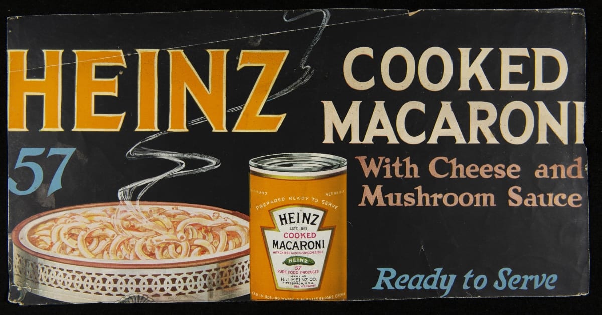 Henry J. Heinz rarely missed an opportunity to market his "57 Varieties" -- a catchy slogan he created despite offering a line of more than 60 packaged food products. A prolific promoter, Heinz aimed to reach consumers in stores, at home, and everywhere in-between. This colorful poster advertised Heinz Cooked Macaroni to passengers riding in a streetcar.