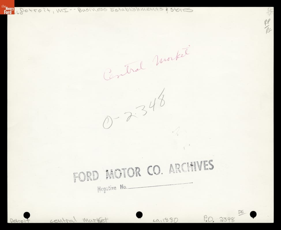 Open-air public markets consolidated sales of perishable fruits and vegetables for easy access by urban consumers. This vegetable shed at Detroit's Central Market, constructed in 1860 with 48 cast-iron columns and ornate timber framing, provided shelter to dozens of market gardeners, florists, and other vendors. It was located on Michigan Grand Avenue between Bates and Randolph Streets. City officials closed the market and dismantled it in 1894.