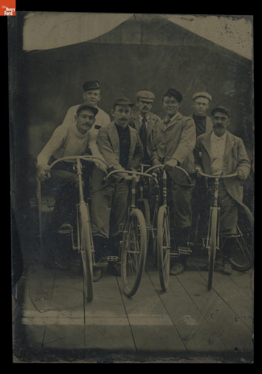 Bicycle riding became a popular American pastime in the late 19th century, particularly after the introduction of the safety bike -- with front and rear wheels of the same size -- in the mid-1880s. The men in this tintype, taken in a studio, used safety bicycles as props with which to pose for a group portrait.
