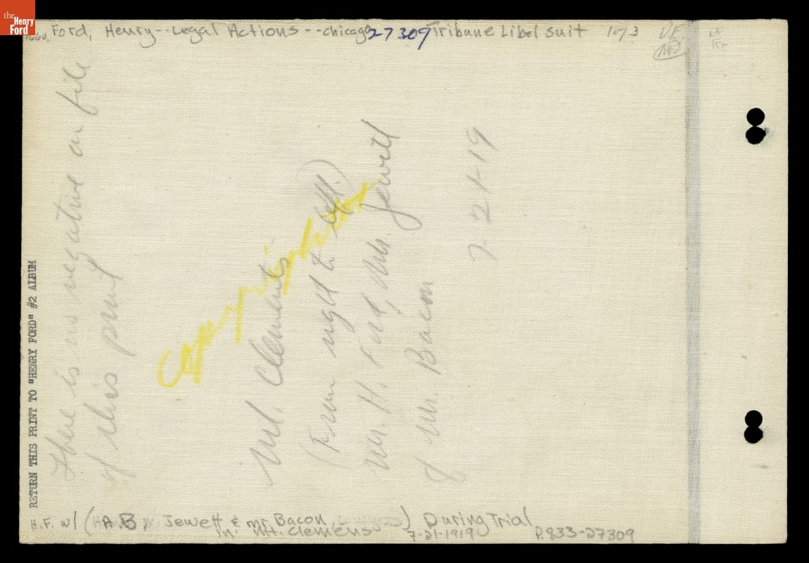 When Henry Ford sued the Chicago Tribune for libel, the million-dollar lawsuit made national headlines. Ford's shaky court testimony, in which he mangled basic American history facts, shocked lawyers but further endeared him to working people. The trial took place in 1919 at Mount Clemens, Michigan, 25 miles northeast of Detroit. The jury found for Ford but awarded him just six cents.