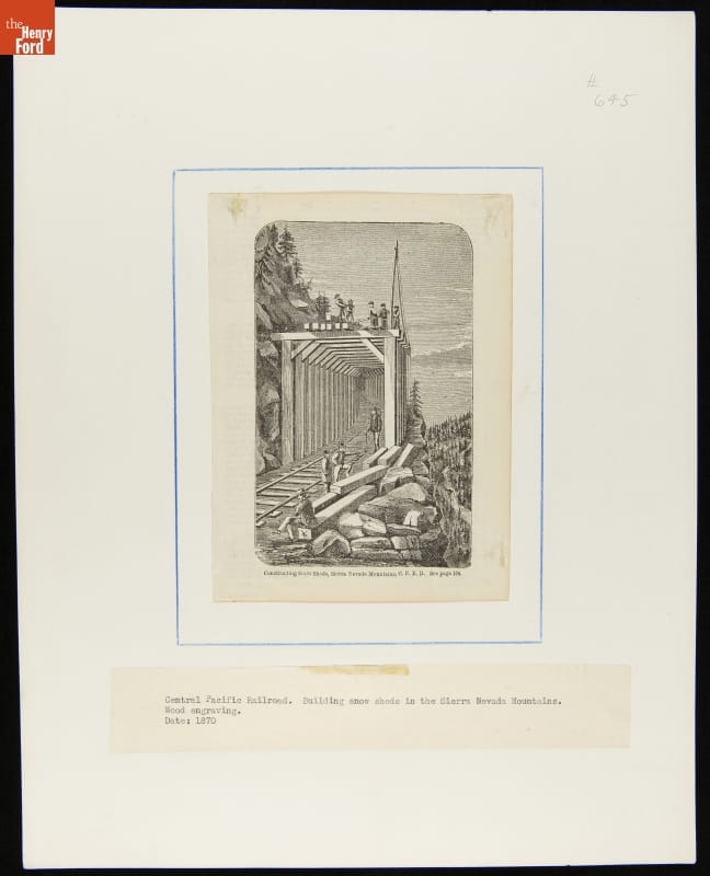 The Central Pacific Railroad crossed the Sierra Nevada Mountains through Donner Pass, some 7,000 feet above sea level. Winter snows -- up to 40 feet in a season -- were a menace, first to the railroad's construction and then to its operation. CP dealt with the problem by building some 40 miles of sheds to protect its track from snowfalls and snowslides.