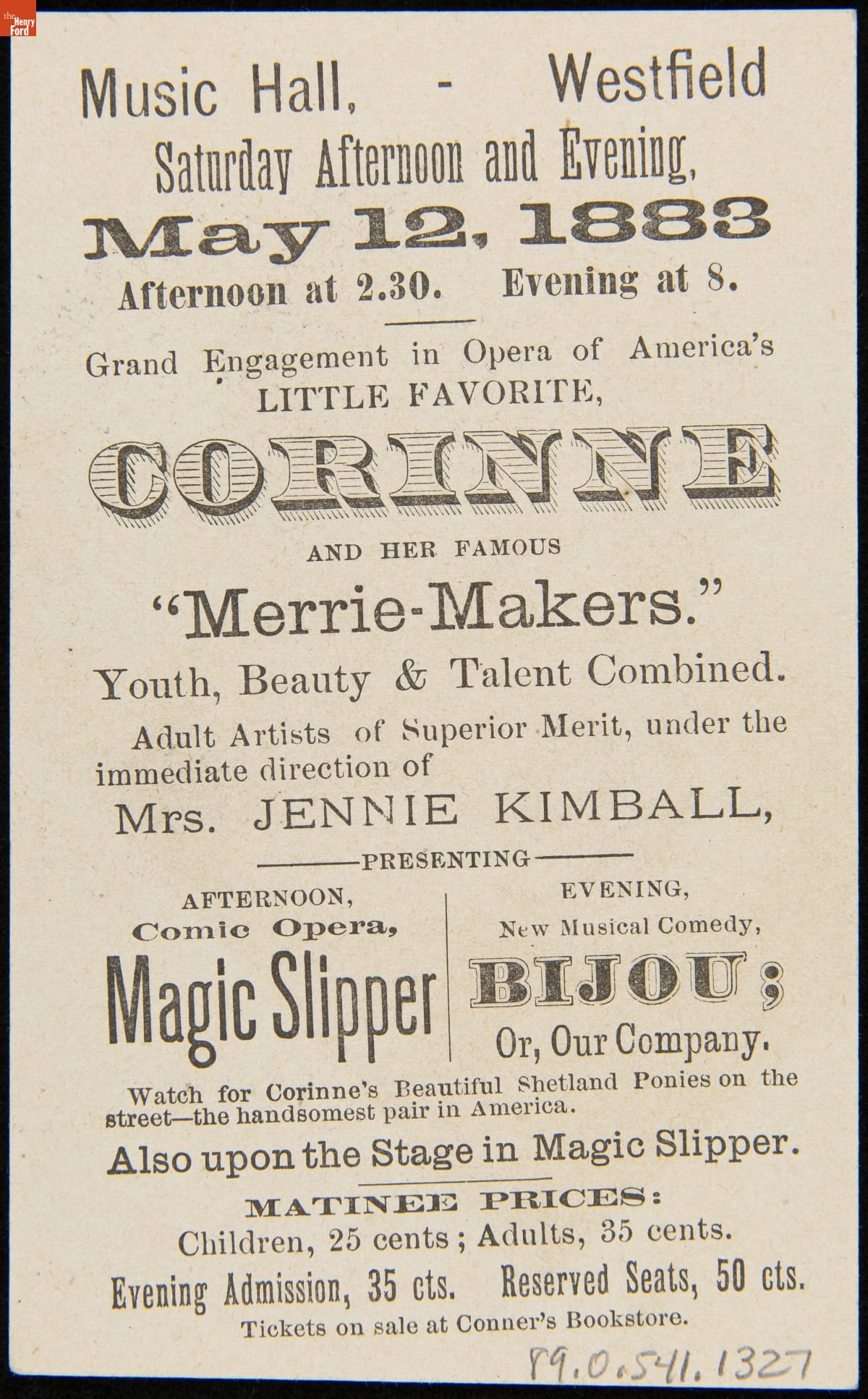Trade Card for the Westfield Music Hall Featuring "Corinne, The Lyric Star and Dramatic Wonder," May 12, 1883