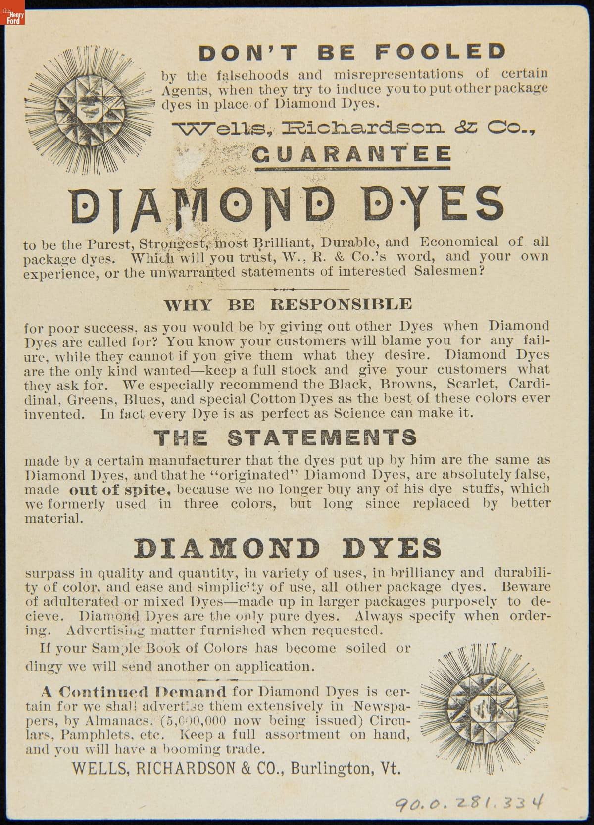Trade Card for Diamond Dyes, Wells, Richardson & Co., 1880-1900