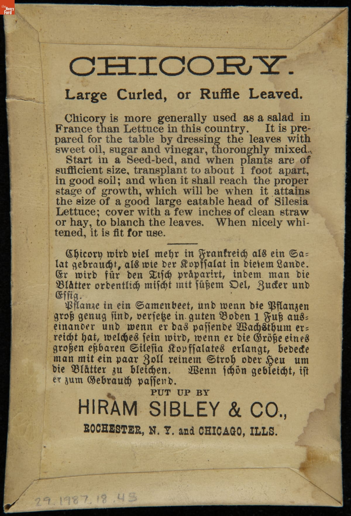on front: CHICORY / LARGE-ROOTED / SEND FOR OUR ILLUSTRATED CATALOGUE... / HIRAM SIBLEY & CO. / ROCHESTER, N.Y. & CHICAGO, ILL.