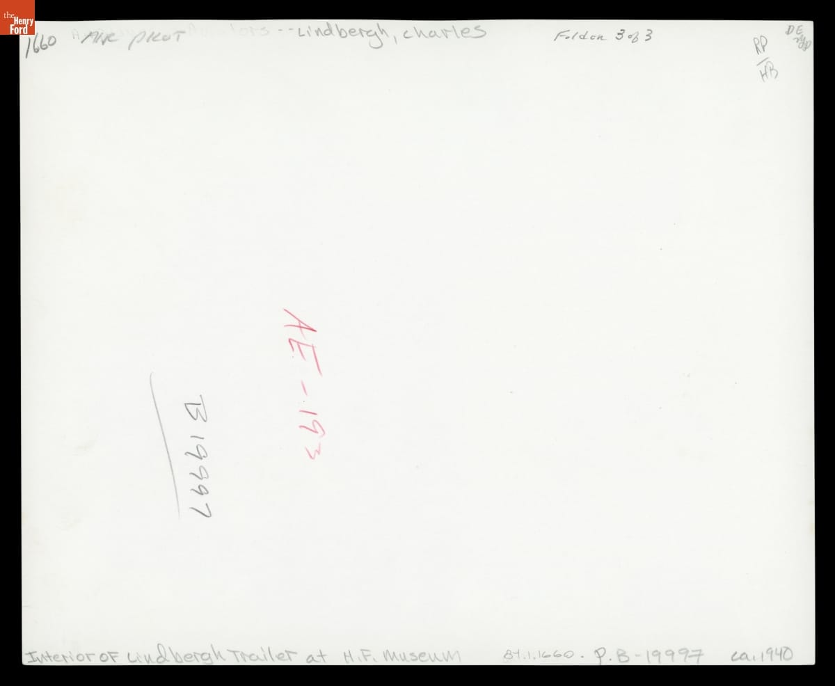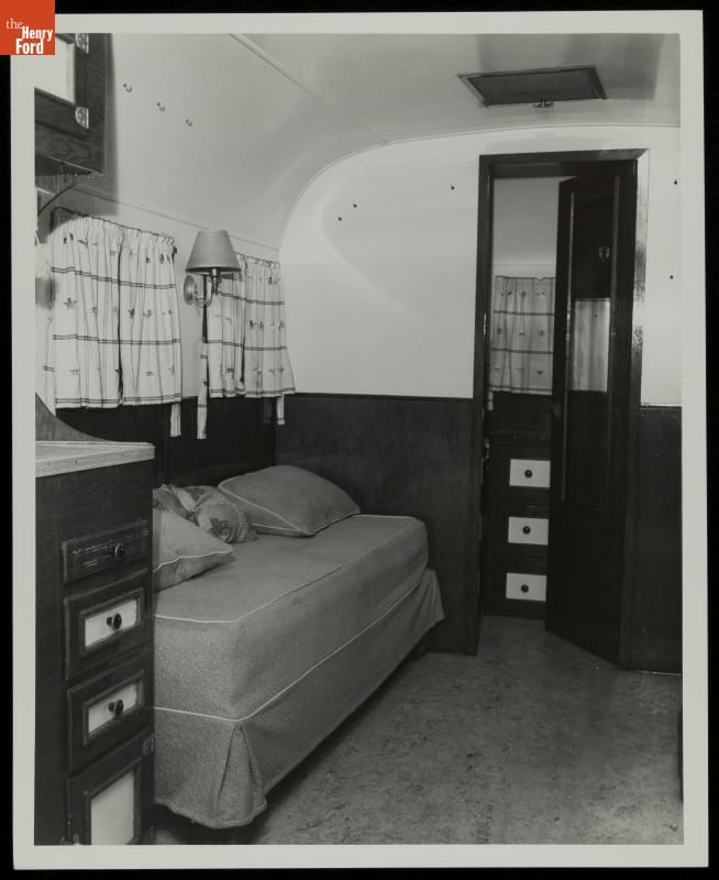 This photograph shows the interior of the trailer Henry Ford gave to his friend Charles Lindbergh in 1942. Charles and his wife Anne used it as a home on the road and as a spare room and study at home. Anne wrote The Steep Ascent here, and Charles wrote portions of his Pulitzer Prize-winning book The Spirit of St. Louis.
