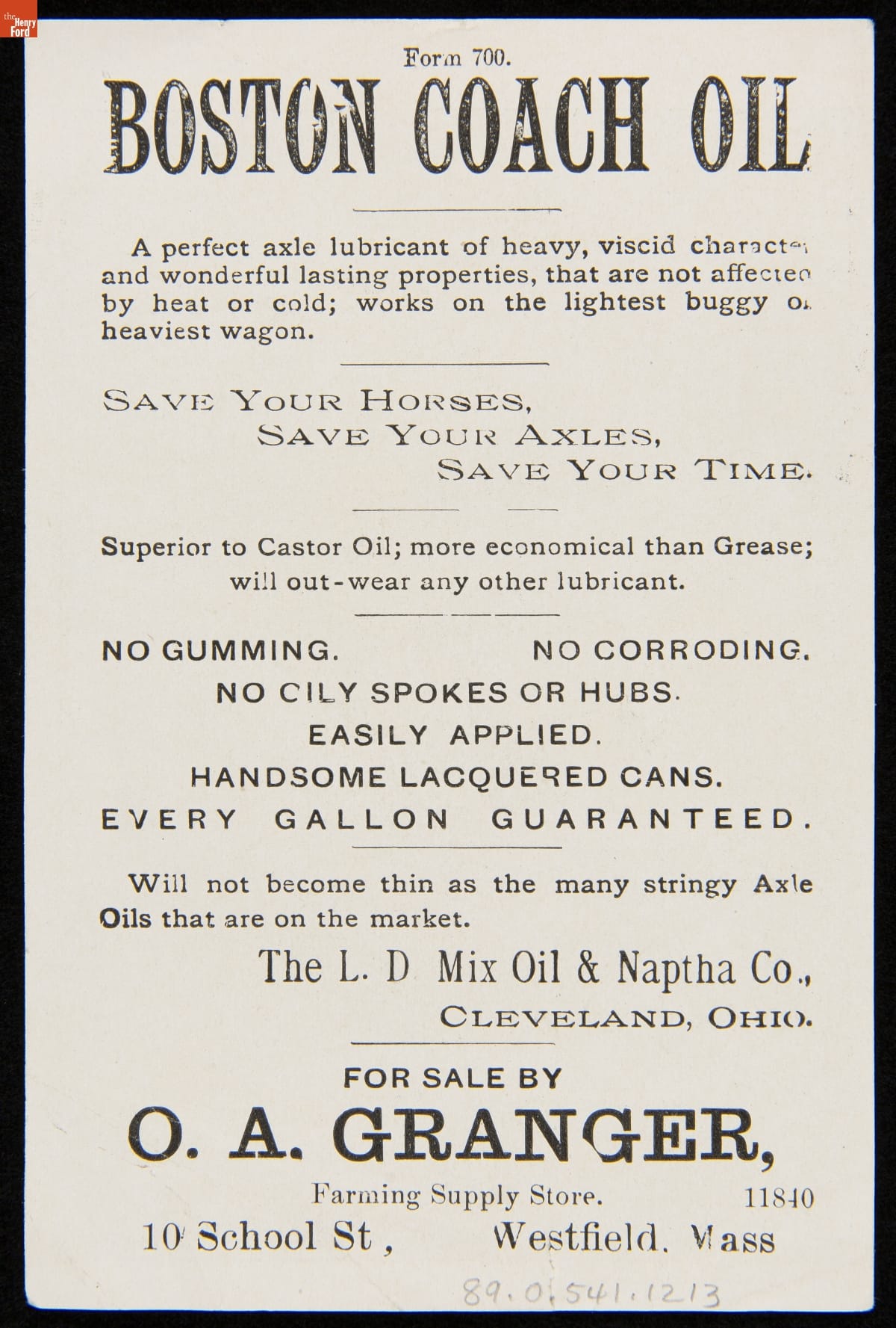 Trade Card for Boston Coach Axle Oil, L.D. Mix Oil & Naptha Company, 1880-1900