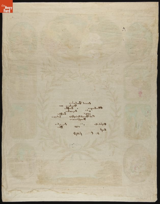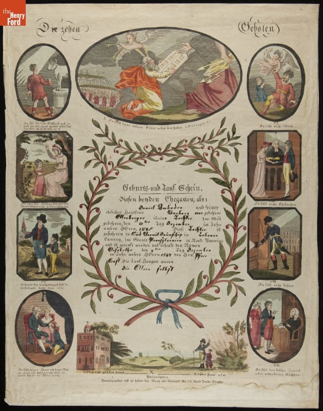 Early German immigrants created decorative keepsakes to commemorate important family events. These documents, known as Fraktur, usually incorporated intricate lettering, elaborate borders and colorful drawings. By the late 1700s, some Fraktur had printed elements. Philadelphia publishers Mentz & Rovoudt created this Fraktur depicting the Ten Commandments. Later, the images were hand colored and names were inserted. The Fraktur commemorates the birth and baptism of Elisabetha Ombaden.