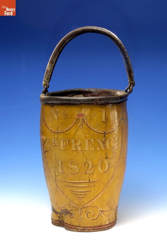 Many home and business owners in colonial and early America kept leather fire buckets in case of emergency. When a fire broke out in the community, owners tossed their buckets into the street, where firefighters and local citizens used them to carry water to put out the fire. Buckets decorated with names, initials and numbers helped owners identify their buckets after the fire had been extinguished.