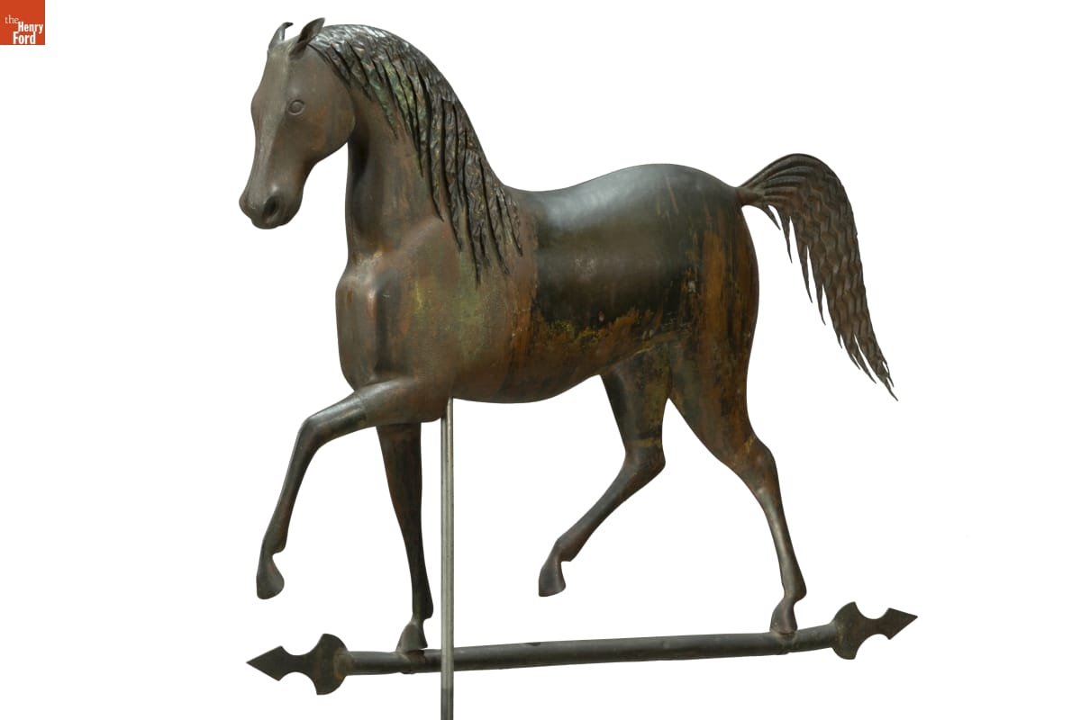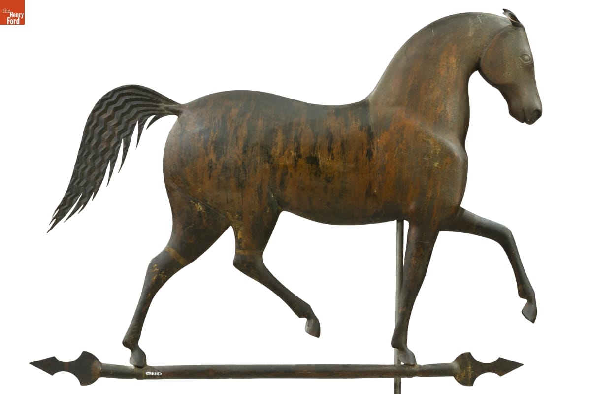 Weathervanes point into the direction of the wind. This helped viewers anticipate weather changes before local forecasts became common after 1920. Functional weathervanes required a basic pointing device and directional arms, but manufacturers added decorative elements, or ornaments, to appeal to consumer interests. They most often featured horses. This example with a crimped copper mane and tail depicts Lady Suffolk, a famous racehorse.