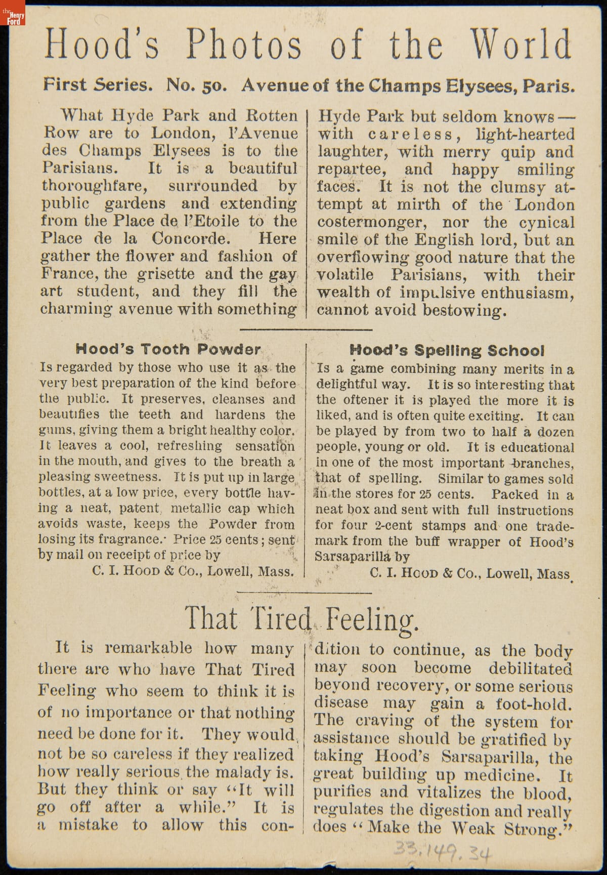 Trade Card for C.I. Hood & Co. with Hood's Photos of the World, "Avenue of the Champs Elysees, Paris," 1890-1910