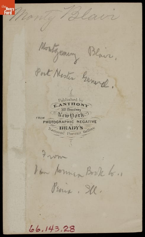 Cartes-de-visite, small, professionally made photographs on cardboard stock, remained popular in the United States from the Civil War in the 1860s through the 1880s. Many were given to friends and loved ones, but enterprising photographers also produced images of famous individuals to sell to the collecting-crazed public. Celebrities, military officers and politicians, such as Montgomery Blair, Abraham Lincoln's first postmaster general, were popular subjects.