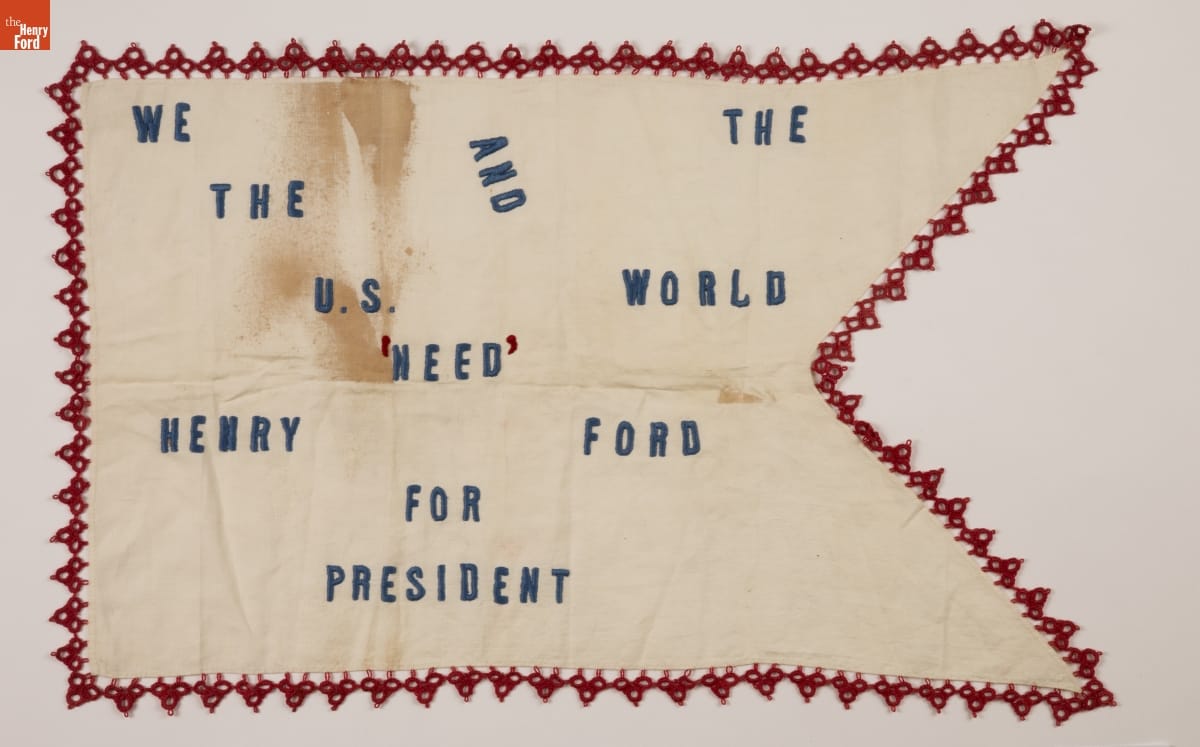 For many women in the early 20th century, Henry Ford's affordable automobile represented freedom and financial security, especially if they were fortunate to be part of the Ford Motor Company family. Often their expressions of thanks were homemade and in this case also politically inspired. Although Henry Ford never admitted to any presidential aspirations, many Americans wanted to see him in the White House.