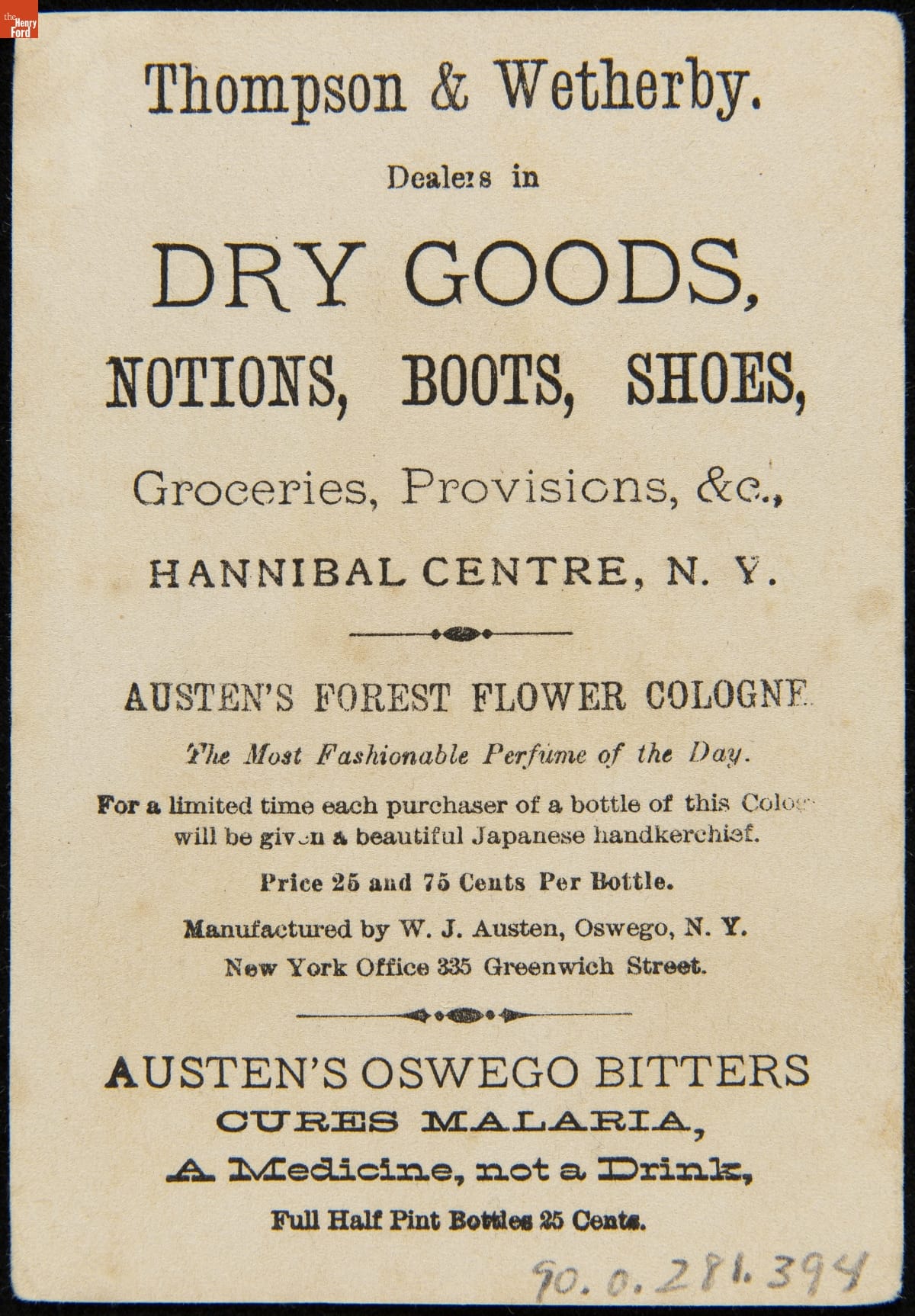 Product manufactured by W.J. Austen & Company, Oswego, New York. Retailed by Thomas & Wetherby, Hannibal Centre, New York.