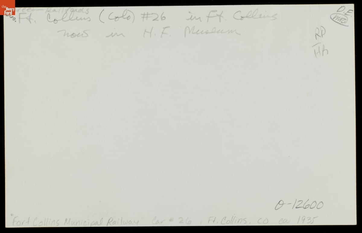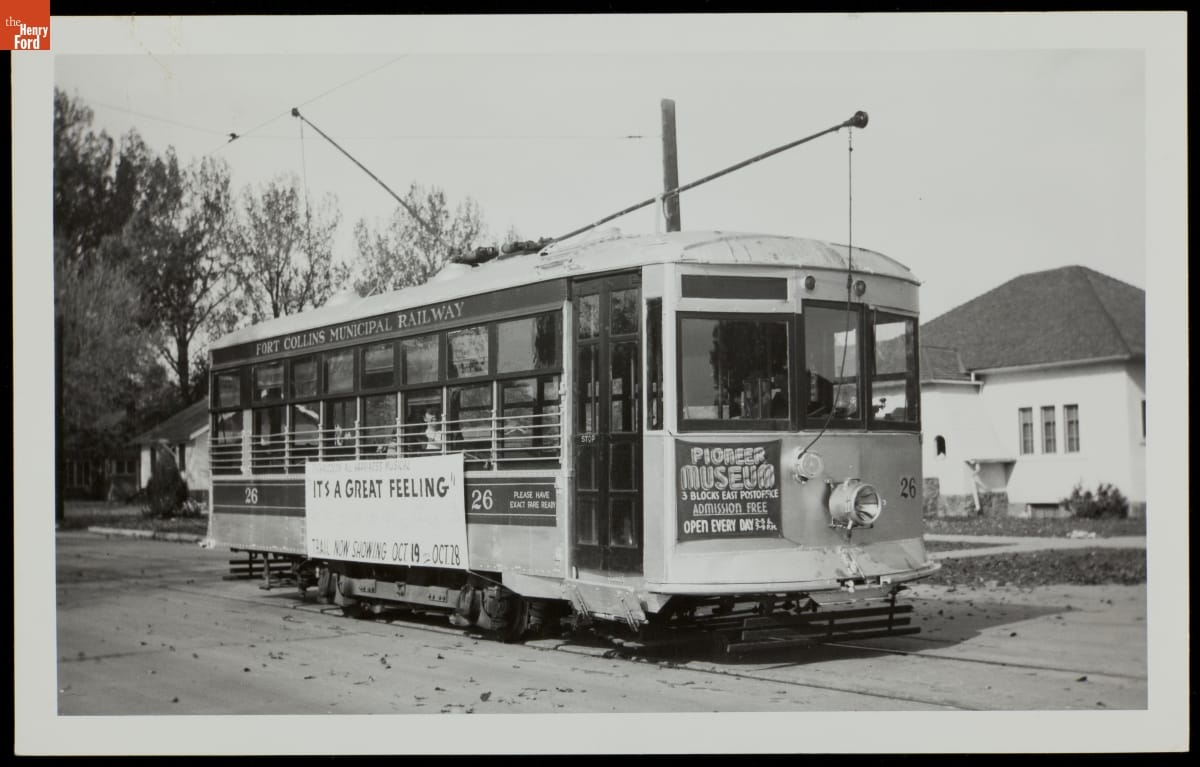 Streetcar 26, a "Birney Safety Car," joined the Fort Collins Municipal Railway in 1924. Birneys were light, required only one operator, and featured built-in safety precautions. They worked well for the small Colorado city's transit system. Streetcar riders could travel conveniently and affordably for school, work, or pleasure--as the signs for a museum and musical on this car suggest.