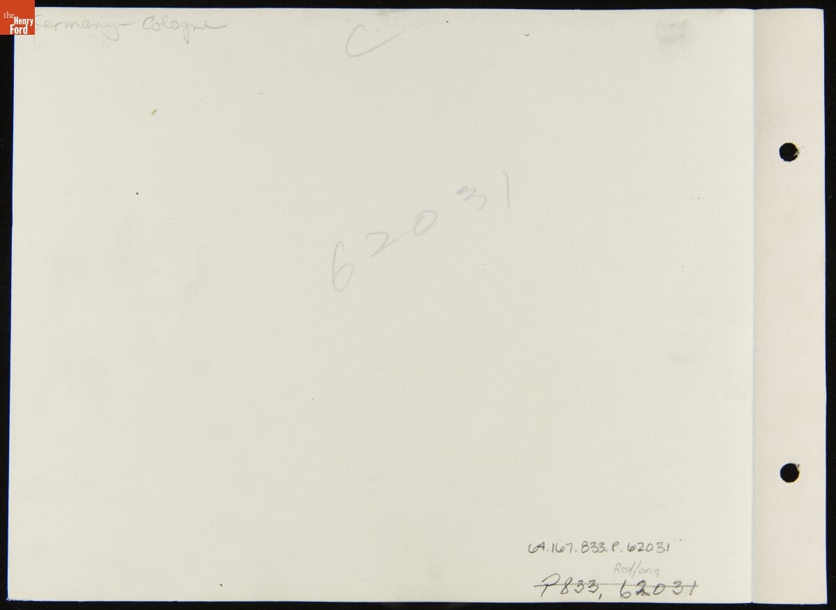 Ford Motor Company operated sales and service branches, as well as factories, in cities around the world. This photograph shows the company's plant in Cologne, Germany. The cornerstone was laid by Henry Ford himself, who visited the site during a European tour in 1930. When the factory opened the following year, it employed some 2,000 people.
