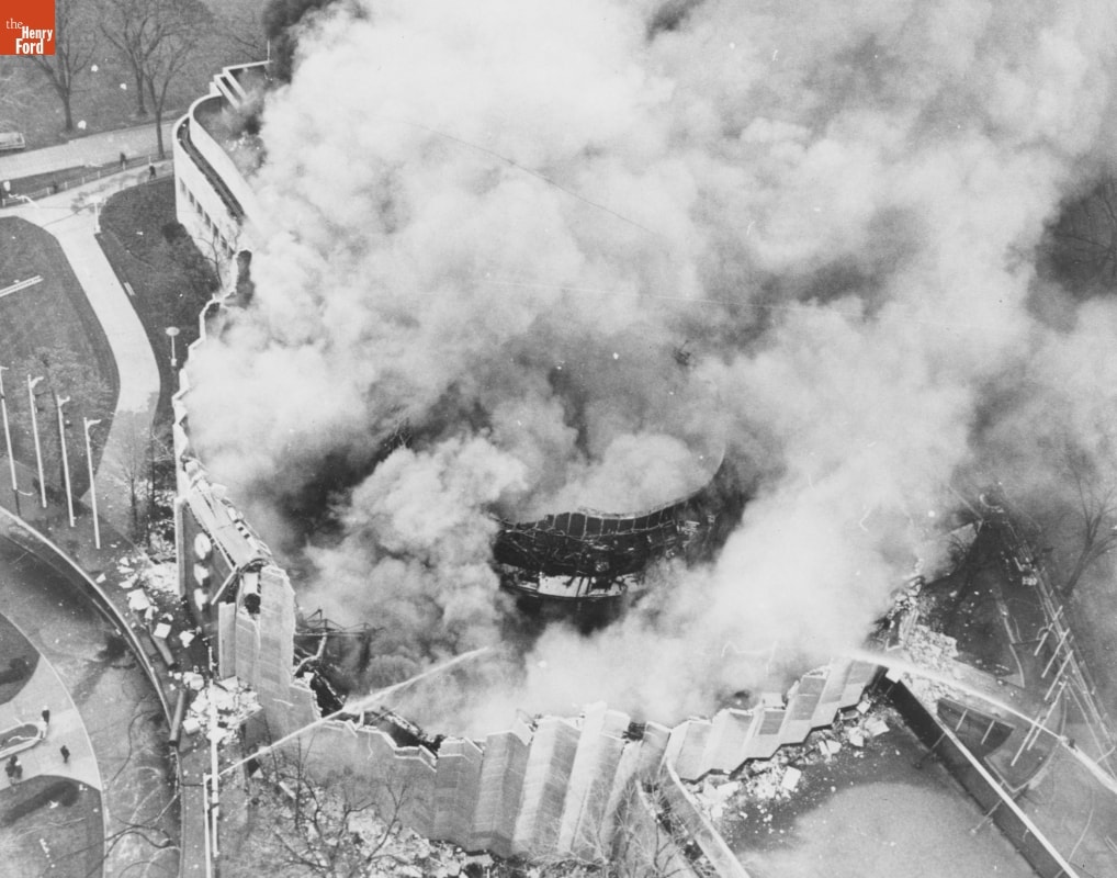 Ford Motor Company brought its central Rotunda building from the 1934 Century of Progress Exposition back to Dearborn and, from 1936 to 1962, recreated the excitement of a World's Fair exposition on its home turf. This photo vividly depicts the Ford Rotunda fire, November 9, 1962, caused when a sealer for the geodesic dome ignited accidentally from a propane heater.