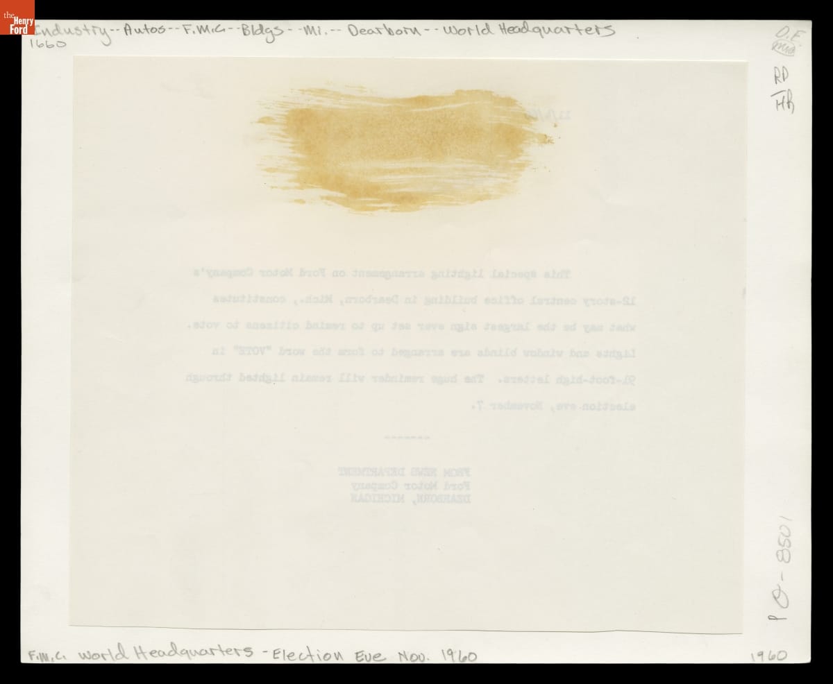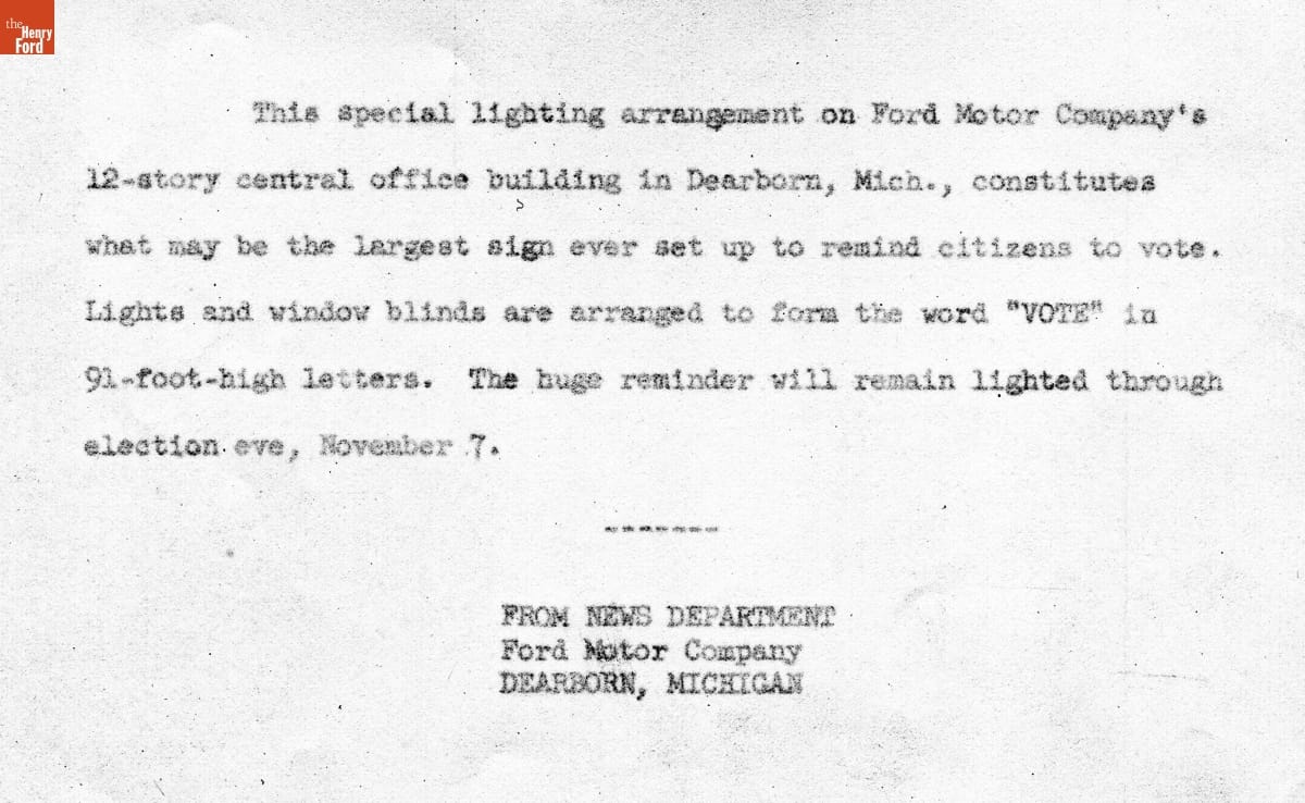 By strategically lighting the grid pattern formed by windows in Ford Motor Company's Henry Ford II World Center, the automaker created special messages on the building's south face. Over the years, the headquarters building displayed messages commemorating holidays, production milestones, racing victories, and other notable events. This message reminded people to vote on Election Day, November 8, 1960.