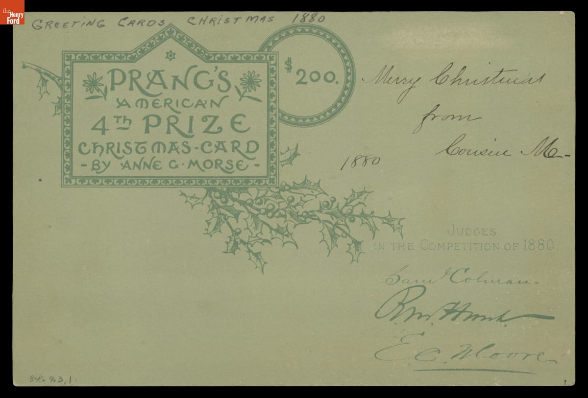 Beginning in the mid-1870s, Louis Prang, a German immigrant printer based in Boston, Massachusetts, created colorful chromolithographed Christmas cards. Prang later initiated a Christmas card design contest for American artists, where he would reproduce and sell the winning entries to eager consumers. Four contests were held from 1880 to 1884. This card shows one of the winning designs for 1880.