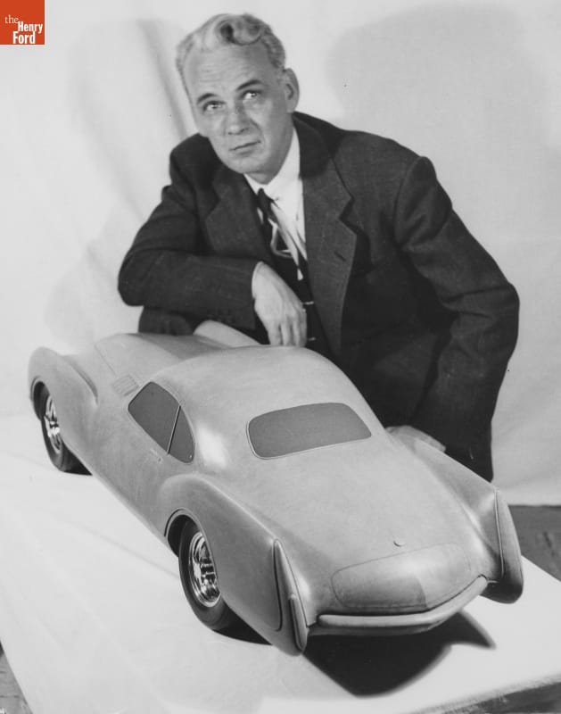Automobile designer Virgil Exner posed with a Chrysler concept car model in 1951. Exner's influential career included design work with General Motors, Raymond Loewy Associates, and Studebaker. He is best remembered for his work at Chrysler. Exner's "Forward Look," featured on Chrysler vehicles from 1955-1961, remade the company's stodgy image with sleek, smooth lines inspired by jet aircraft.