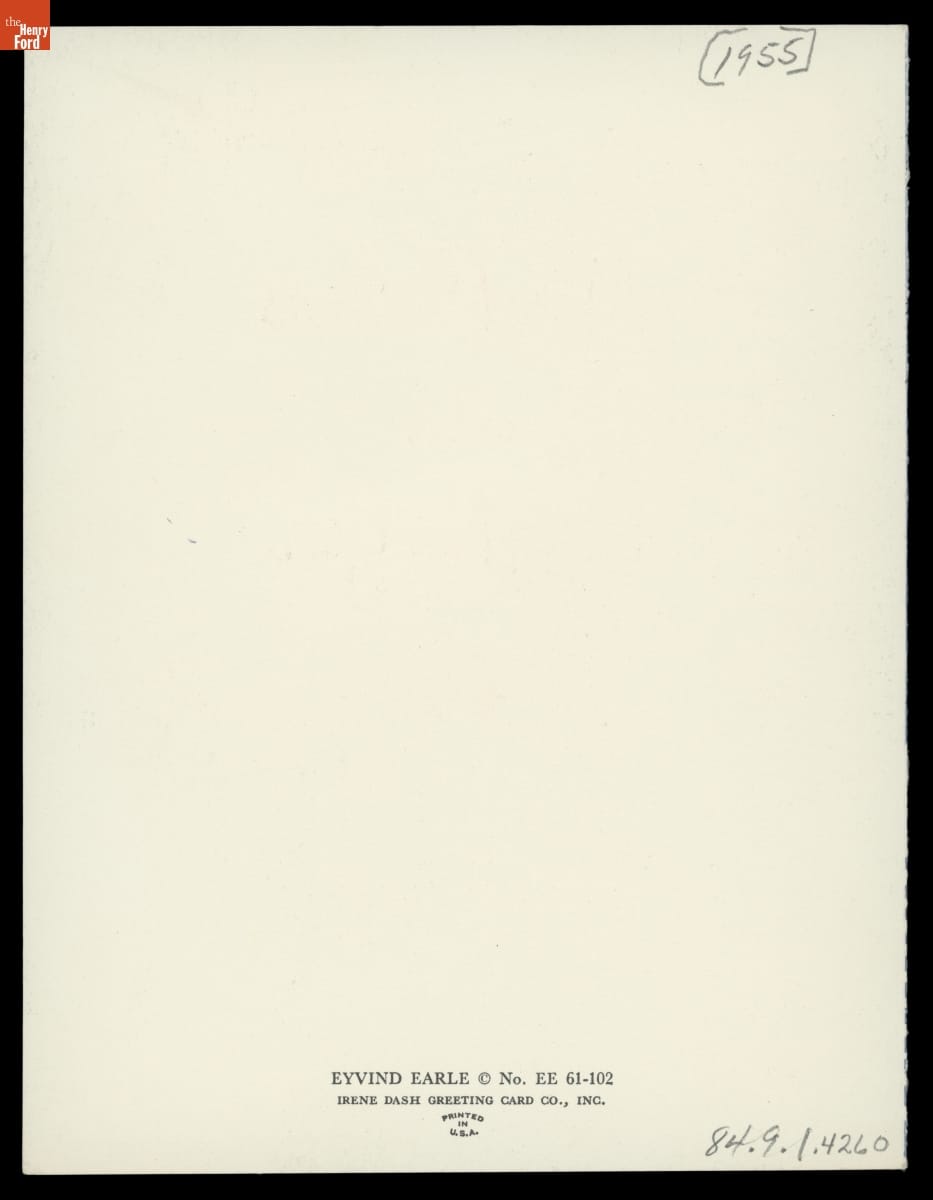 The artist Eyvind Earle (1916-2000) is best known for his work on the 1959 Walt Disney Studios animated film Sleeping Beauty, but he also designed Christmas cards. Earle began producing cards in his early twenties, selling them through his own company. Later, Earle joined the American Artists Group and continued designing Christmas cards. He would produce more than 800 designs throughout his career.