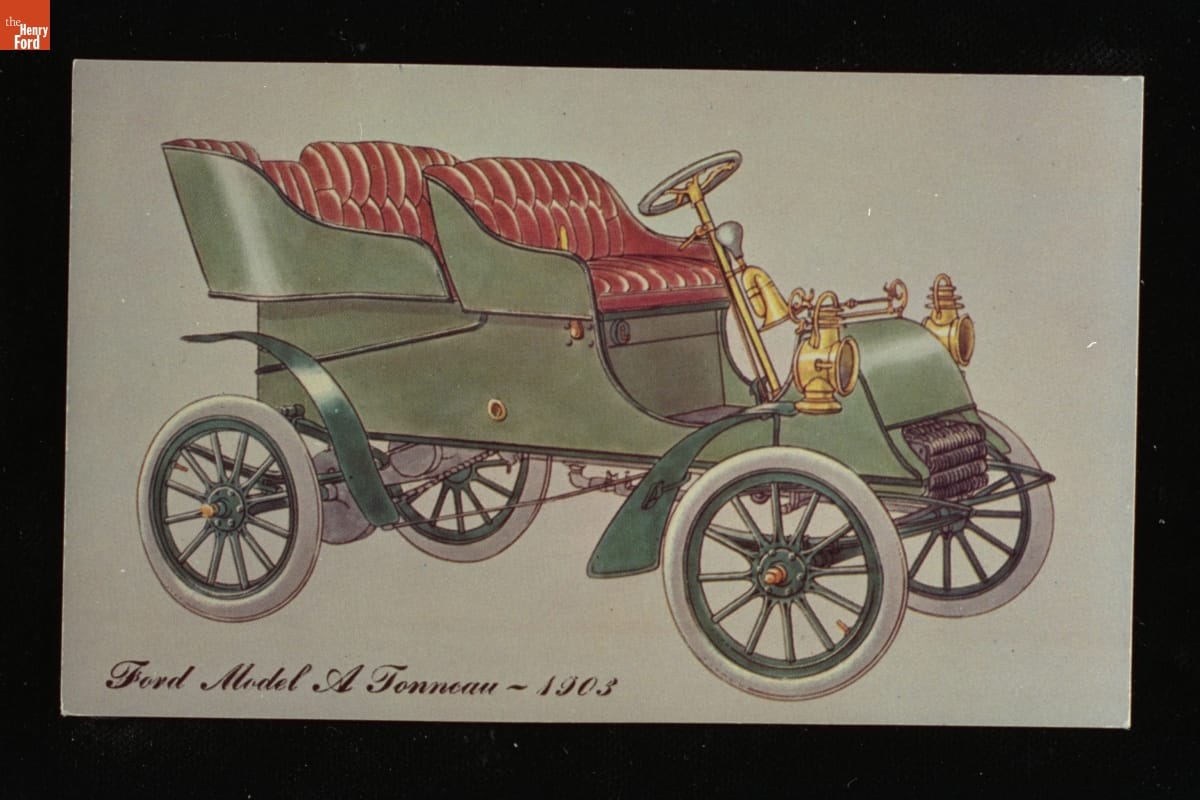 This postcard, featuring an illustration of an early Ford automobile, was published by the Autoprints company of New York. Postcards like this were sold to visitors at Henry Ford Museum & Greenfield Village in the 1950s. Ford Motor Company, founded by Henry Ford in 1903, revolutionized the American auto industry with the Model T and the moving assembly line.