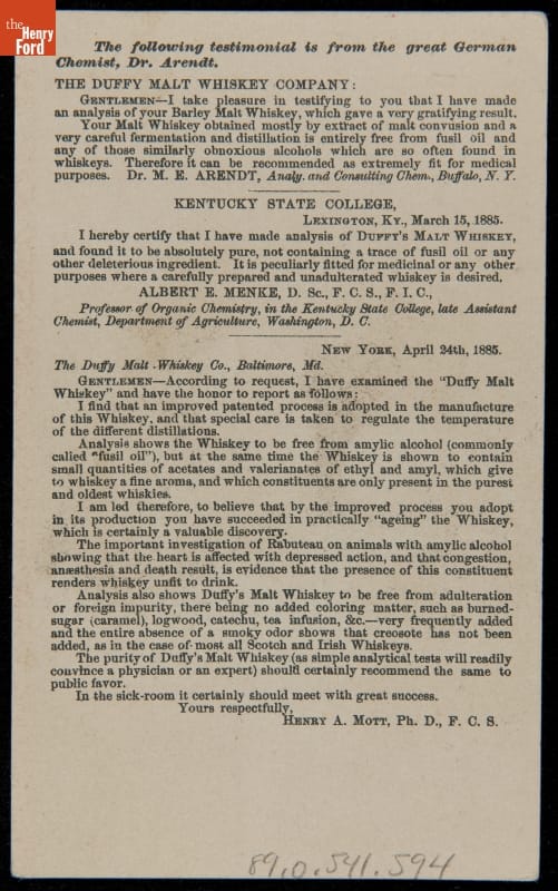 Trade Card for Duffy's Malt Whiskey, circa 1885