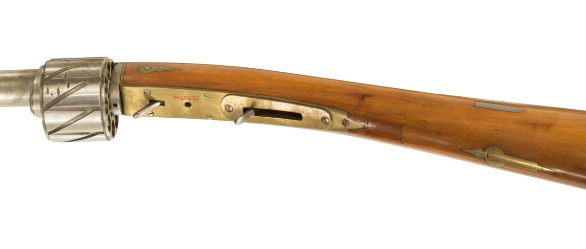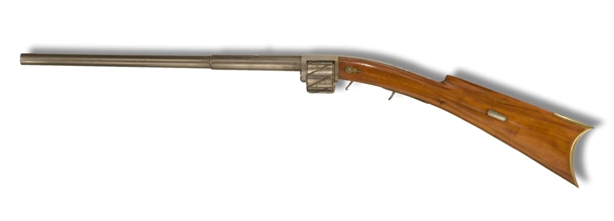 On left side of stock, engraved in script: WHITTIER'S / SPIRAL REVOLVING