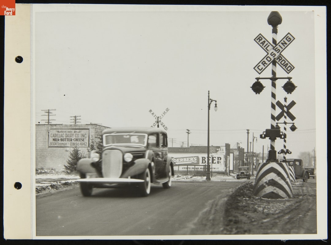 Lincoln Automobile Driving Over Railroad Crossing, December 1934