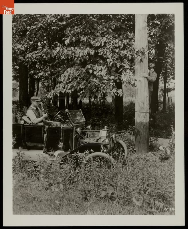 Mobile phones in 1913? Not quite. The men in the Model T in this photo are telephone linemen, testing the line in a wooded area.