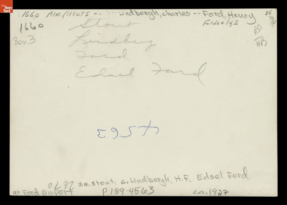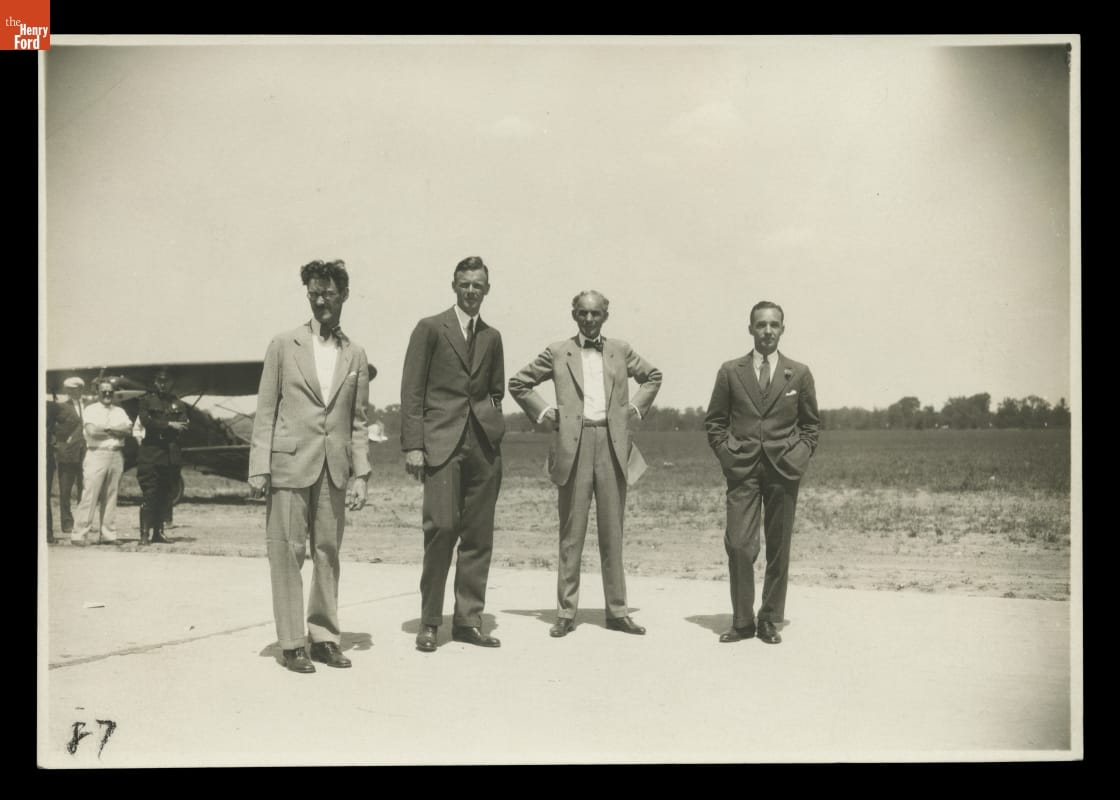 Months after his historic solo flight across the Atlantic, Charles Lindbergh began a national tour to promote commercial aviation. In August 1927, the "Lone Eagle" touched down in Dearborn, Michigan. This photograph shows Lindbergh (second from the left) standing with William Stout and Henry and Edsel Ford. Stout operated a passenger airline after selling his airplane manufacturing business to the Fords.