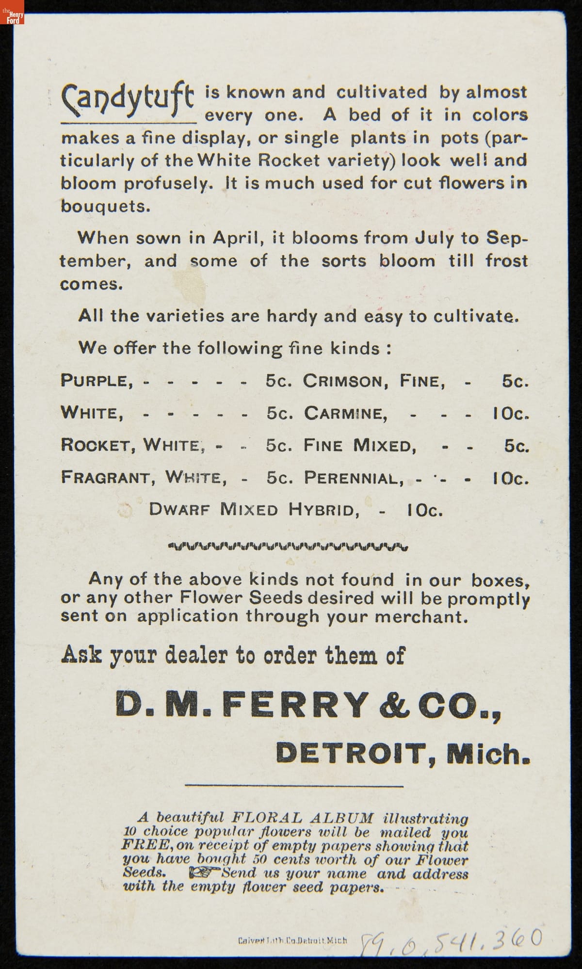 Advertisers used trade cards to sell goods and services and new color printing techniques increased their appeal during the late 19th century. Americans enjoyed and often saved the vibrant little advertisements added to product packages or distributed by local merchants. This trade card from D.M. Ferry & Co. features a colorful image of Candytuft flowers with additional educational information on the back.
