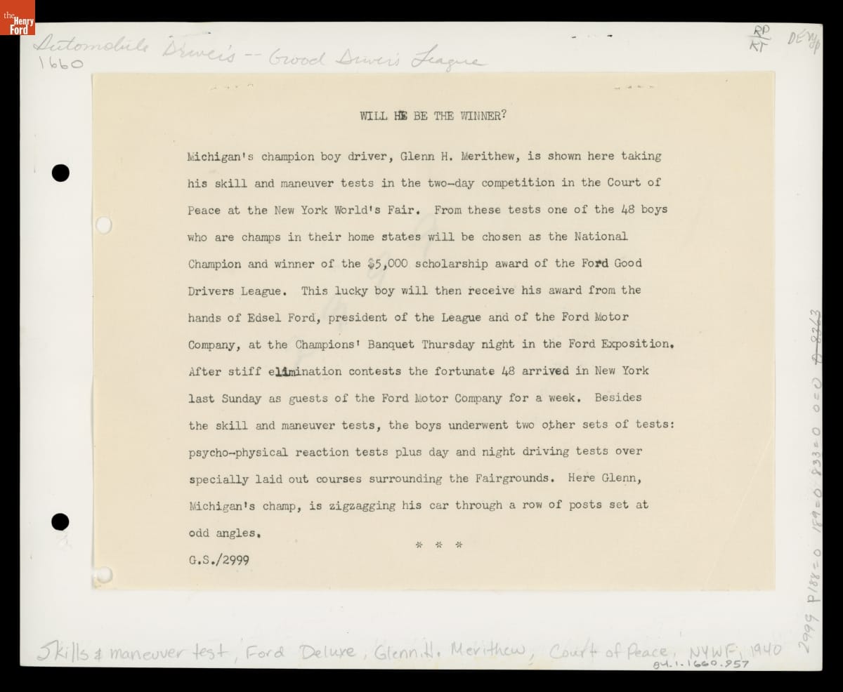 Ford Motor Company created the Good Drivers League in 1940. Headed by Edsel Ford, the League promoted safe driving habits among high school students. More than 60,000 boys competed for 48 university scholarships - ranging from $100 to $5,000 - during the program's first year. Top participants met at the 1940 New York World's Fair for final testing and an award ceremony.