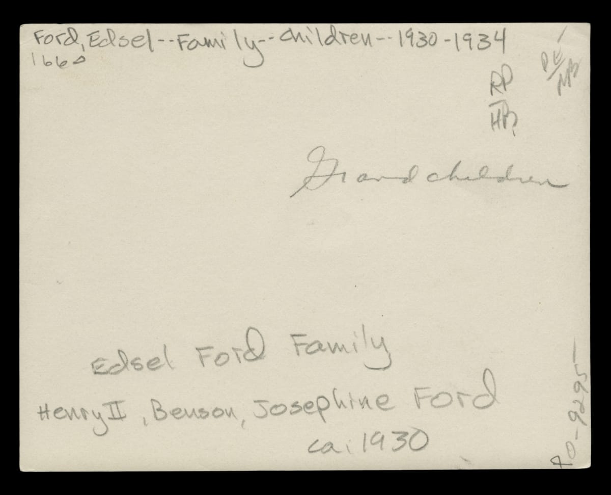 Edsel and Eleanor Ford's children drove cars around the grounds of their parents' home at Gaukler Pointe, and around their grandparents' Fair Lane estate in Dearborn. This photograph, taken about 1930, shows Benson Ford in a Lincoln, Henry Ford II in an MG, and Josephine Ford in a child-sized -- but fully operational -- car.