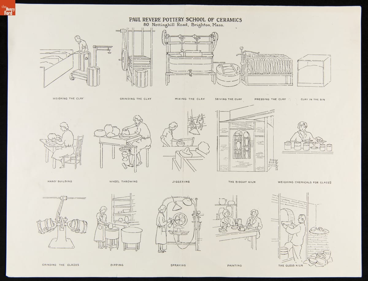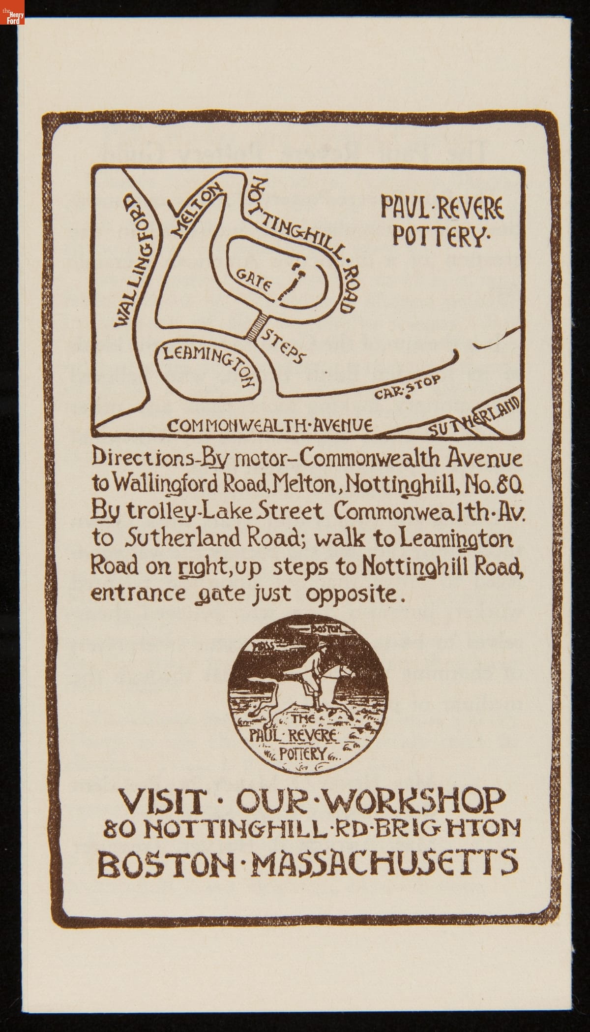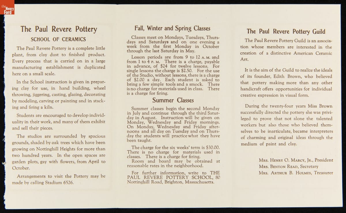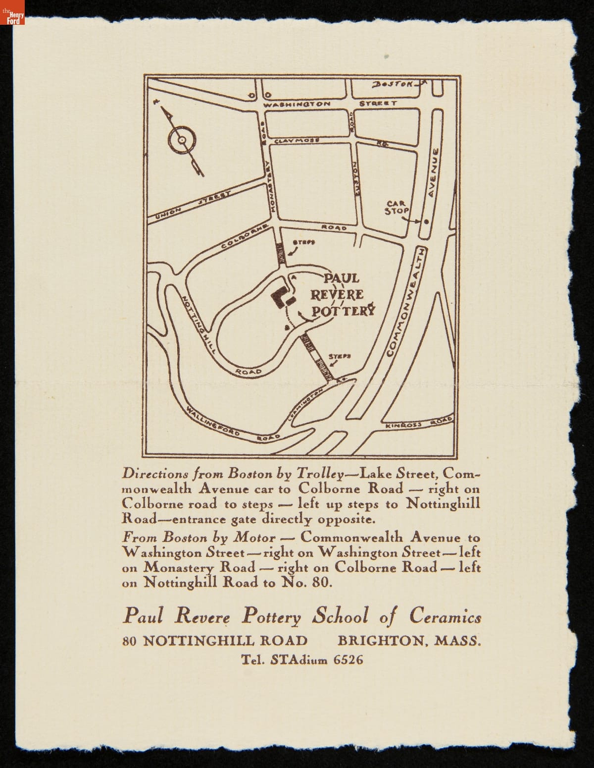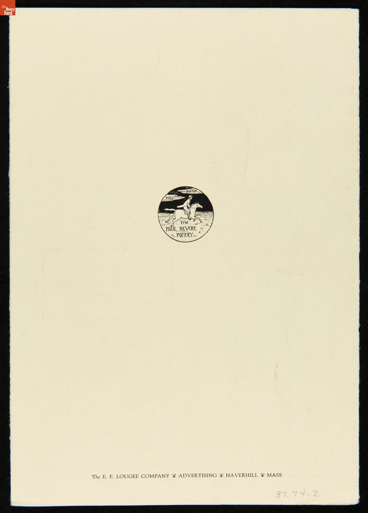 The Paul Revere Pottery evolved from a settlement house founded in 1899 to help women in Boston's North End immigrant community. Founders Edith Guerrier, a librarian, and Edith Brown, an artist, convinced patron Helen Osborne Storrow to fund the pottery in 1906. The venture proved successful, producing remarkable Arts and Crafts wares through the 1930s.