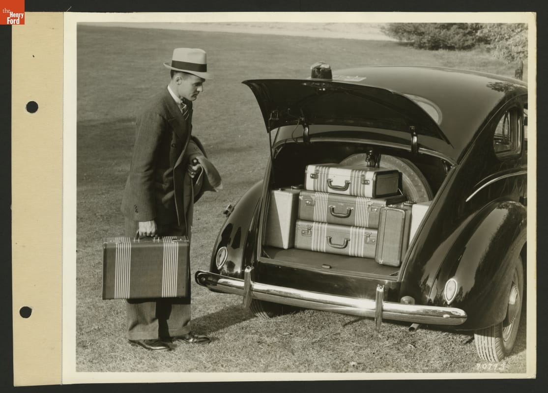 Packing was easier by the late 1930s, when cars had integrated trunks. In this photograph, Ford promoted the spacious trunk of its 1939 V-8 Fordor Sedan.