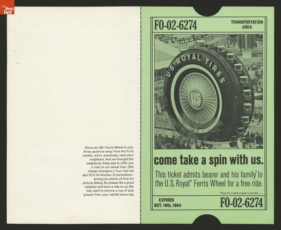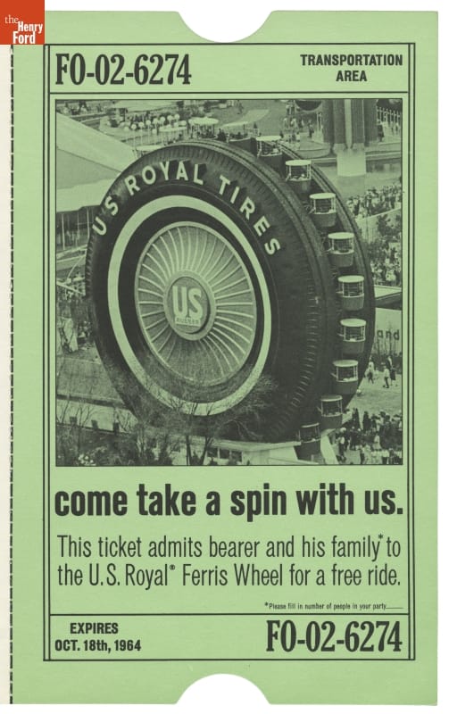 U.S. Royal Ferris Wheel. "Going to the Fair?" After you ride around the Ford Exhibit come take a spin with us. Free ride on U.S. Royal's 80' Ferris Wheel